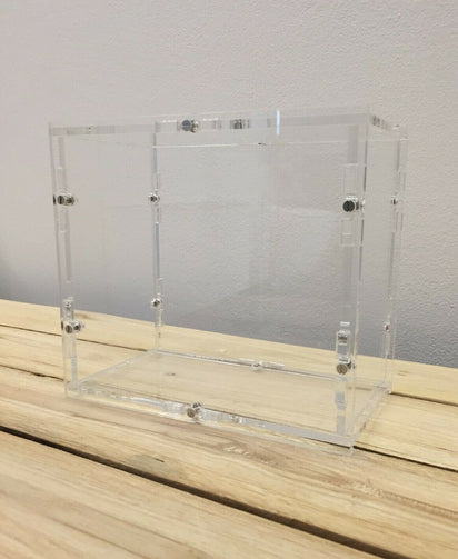 Die Acrylbox ist noch nicht zusammengesteckt und verschraubt. Vor dem Aufbau bitte unbedingt die Schutzfolien von beiden Seiten entfernen.