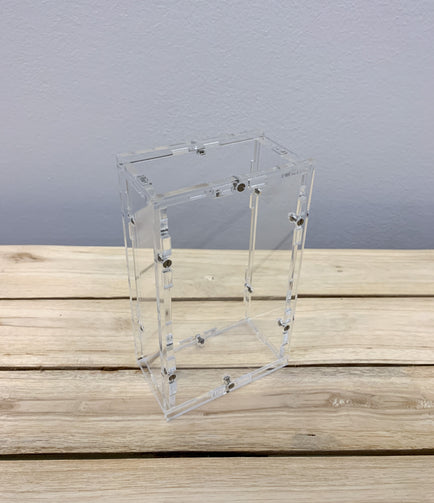 Die Acrylbox ist noch nicht zusammengesteckt und verschraubt. Vor dem Aufbau bitte unbedingt die Schutzfolien von beiden Seiten entfernen.